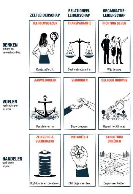 Drie domeinen: zelfleiderschap, relationeel leiderschap, organisatieleiderschap. Drie lagen: denken, voelen, handelen.